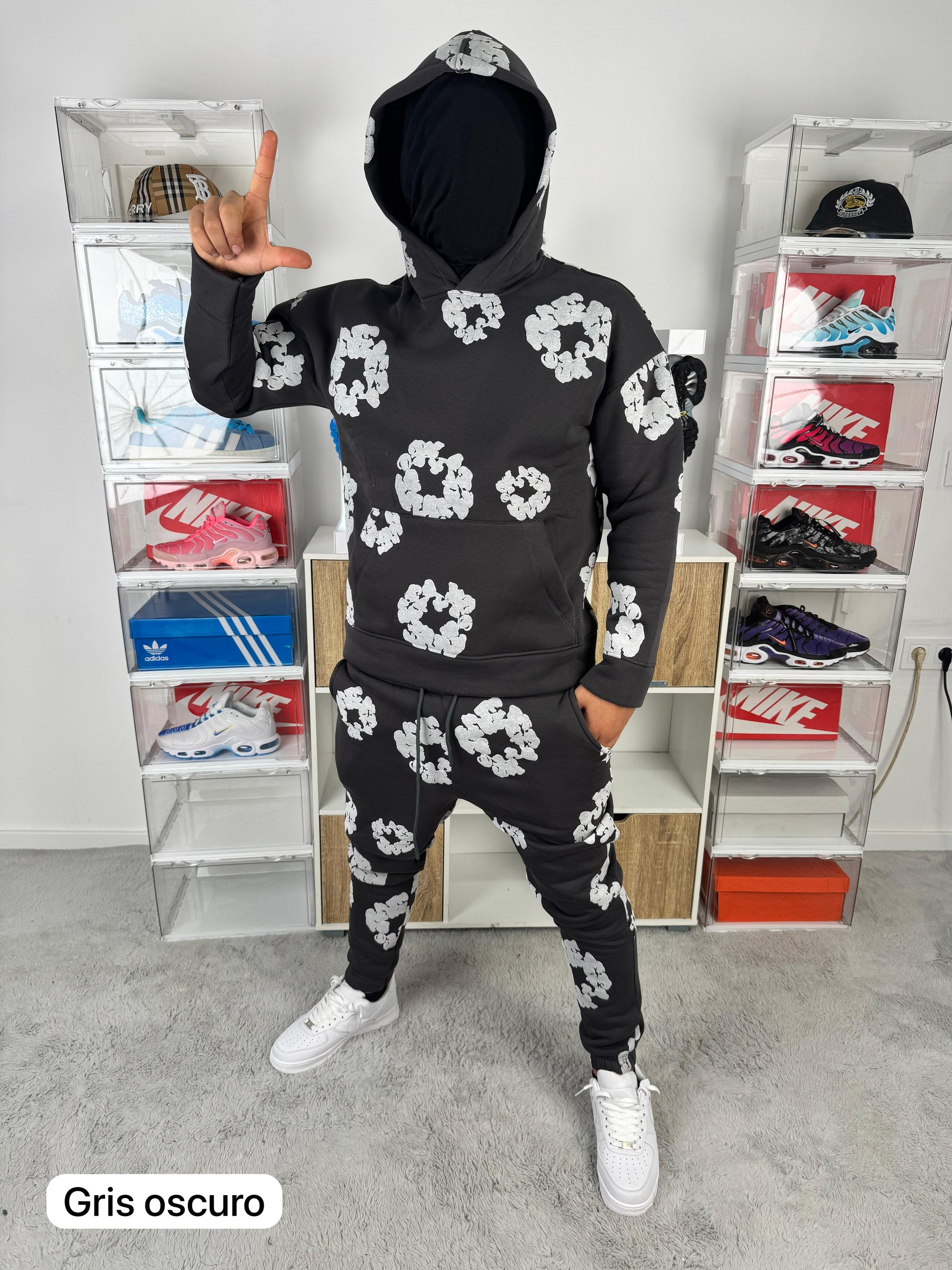 Este conjunto (sudadera + pantalón) está confeccionado con materiales de alta calidad, ofreciendo un ajuste cómodo y resistente. Sus diseños característicos y detalles gráficos lo convierten en un outfit icónico para quienes buscan diferenciarse con un look cargado de personalidad.