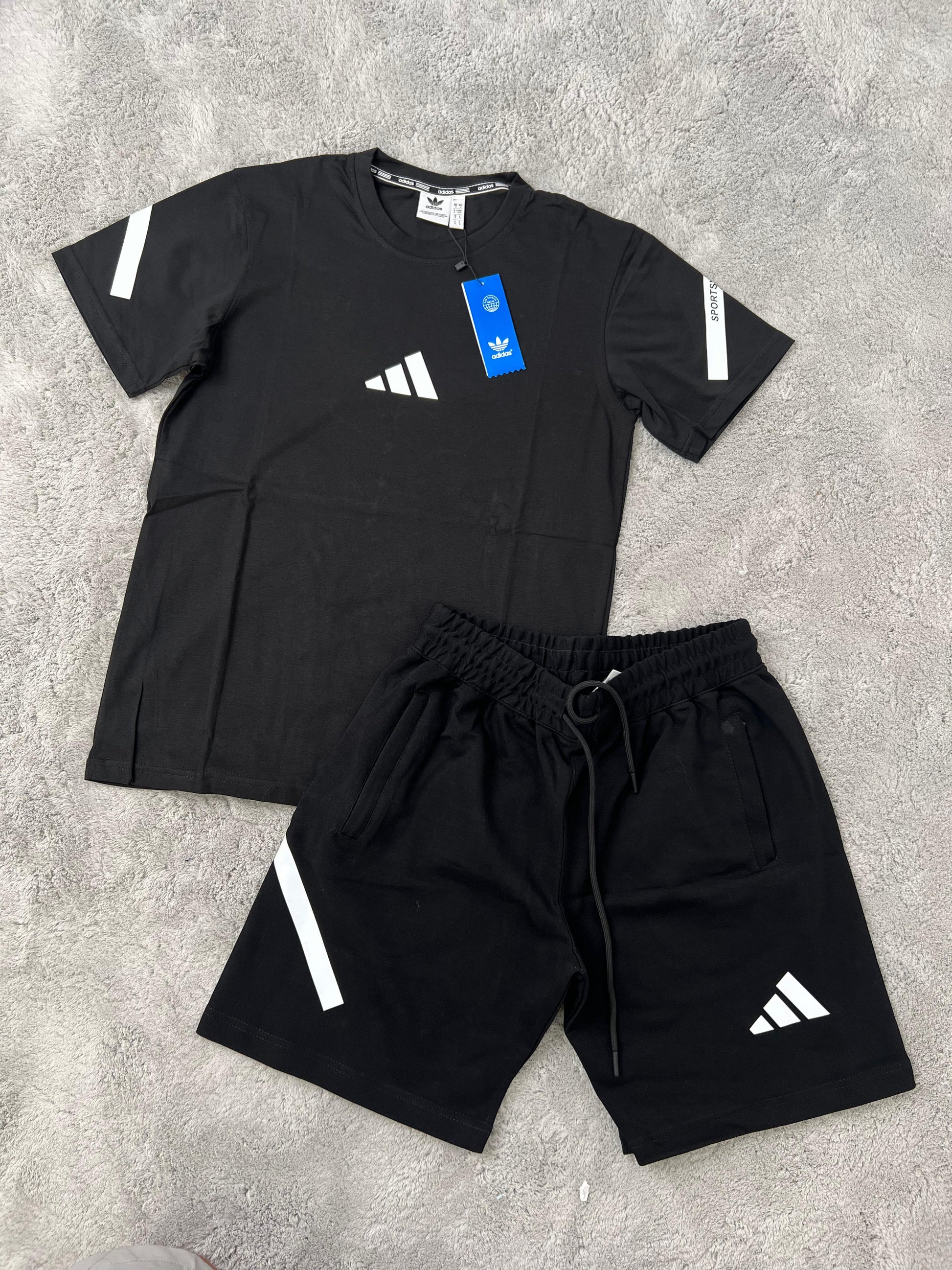 Este conjunto Adidas es perfecto para quienes buscan un look deportivo sin sacrificar la comodidad. La camiseta clásica con el logo Adidas en el pecho y los pantalones cortos con detalles distintivos de la marca proporcionan un estilo moderno y relajado, ideal para el gimnasio o actividades cotidianas.