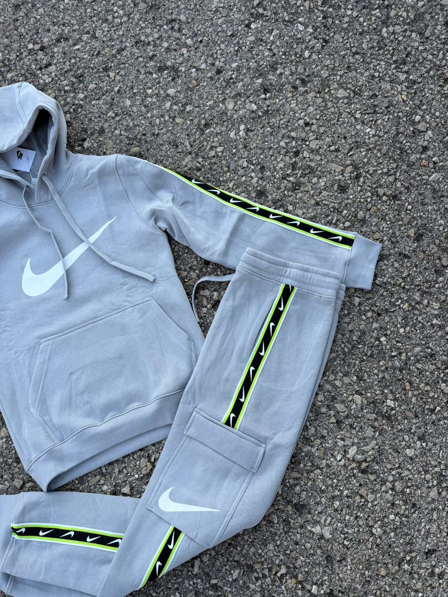 La chaqueta con capucha y cremallera completa se complementa con el pantalón jogger de corte ajustado, logrando un outfit versátil que nunca pasa de moda. Su diseño minimalista en color total Grey con el logo Nike aporta un toque elegante y exclusivo.