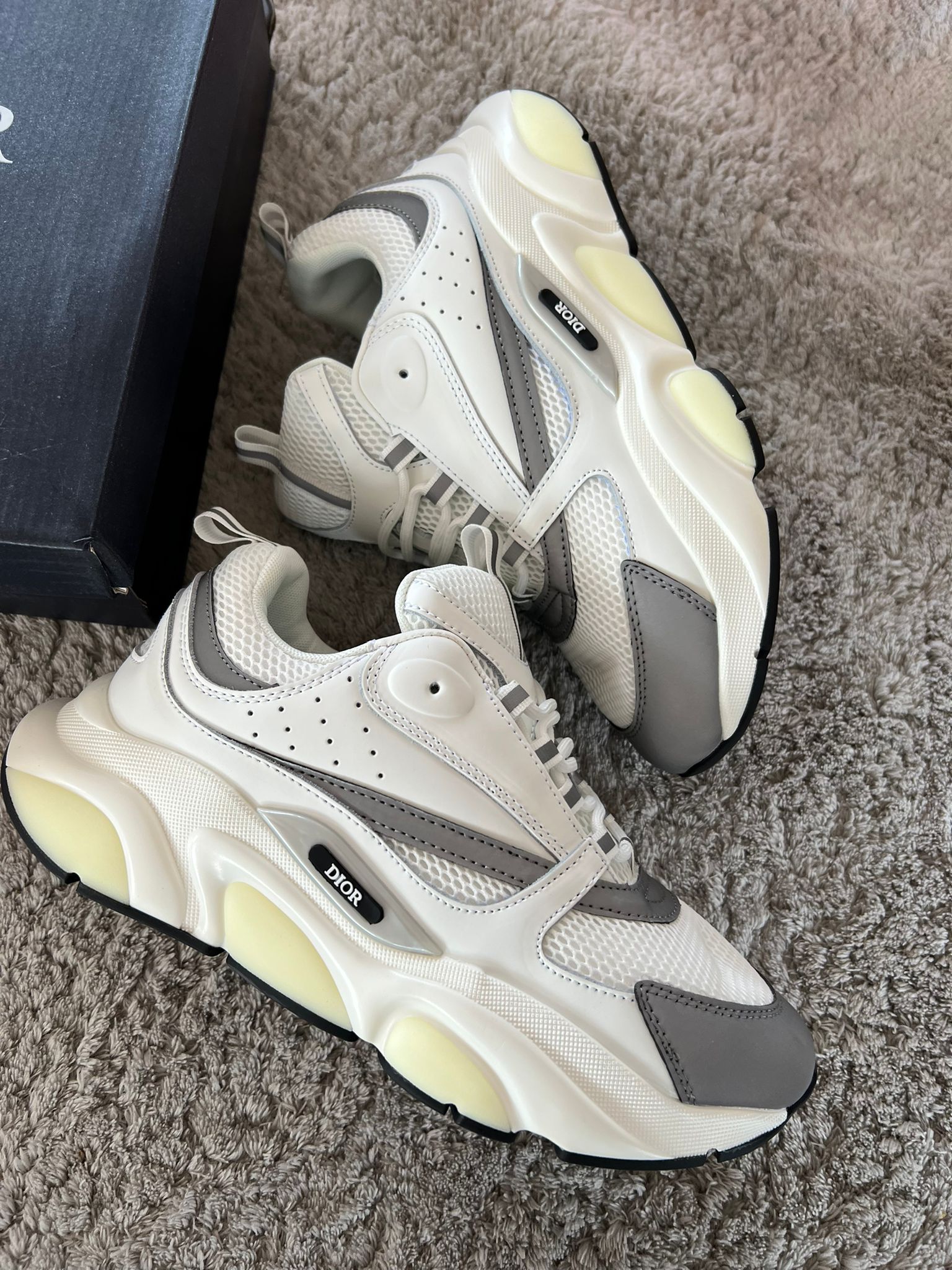 El logo Dior en la parte lateral refuerza la exclusividad de estas zapatillas, mientras que su tecnología de amortiguación asegura una experiencia cómoda durante todo el día. Perfectas para quienes desean un look urbano y sofisticado, las Dior B22 son una verdadera declaración de estilo. ✨